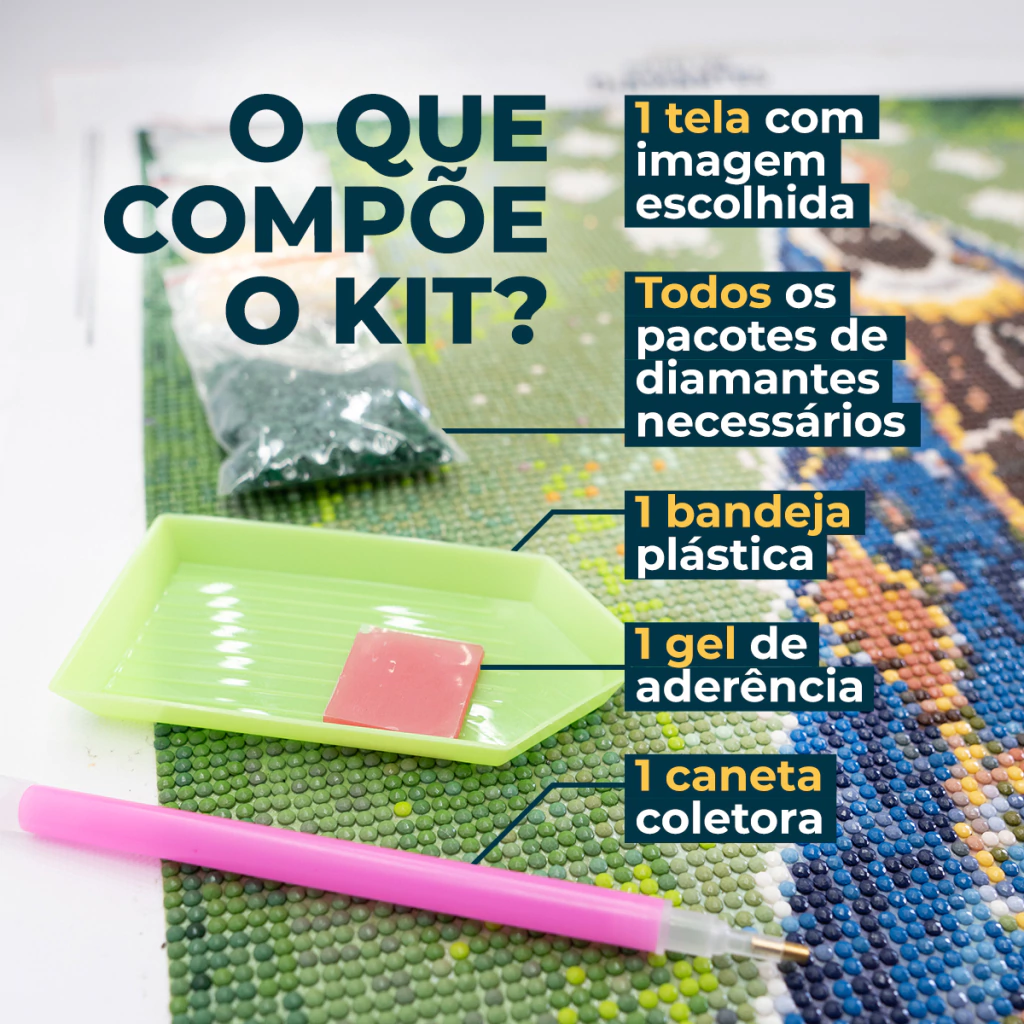 - Saquinhos codificados com todos os diamantes necessários para preencher a tela.